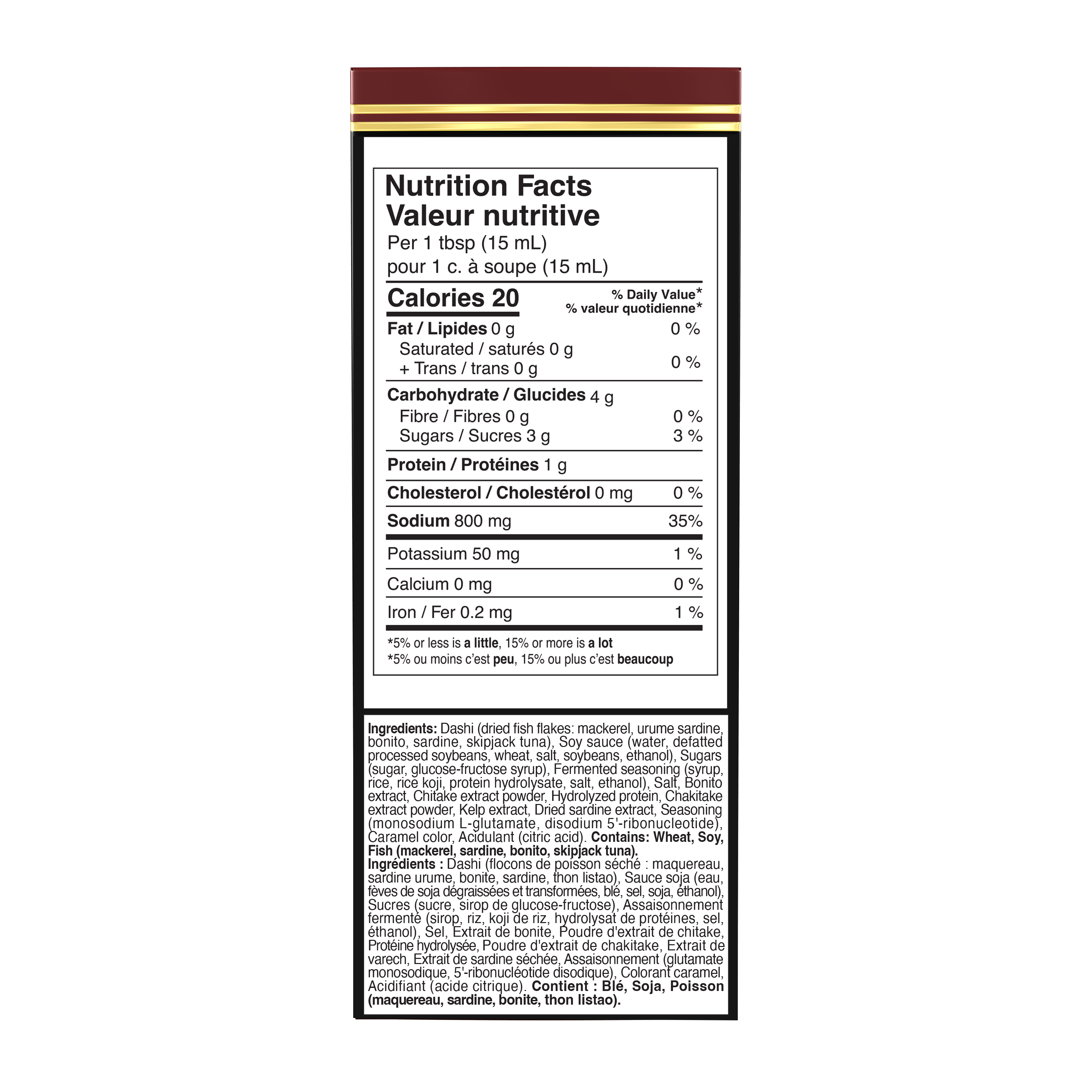 Dashi (flocons de poisson séchés : maquereau, sardine urume, bonite, sardine, listao), sauce soya (eau, soya transformé dégraissé, blé, sel, soya, éthanol), sucres (sucre, sirop de glucose-fructose), assaisonnement fermenté (sirop, riz, koji de riz, hydrolysat de protéines, sel, éthanol), sel, extrait de bonite, poudre d’extrait de chitake, protéines hydrolysées, poudre d’extrait de chakitake, extrait de varech, extrait de sardine séchée, assaisonnement (L-glutamate monosodique, 5′-ribonucléotide disodique), colorant caramel, acidifiant (acide citrique).