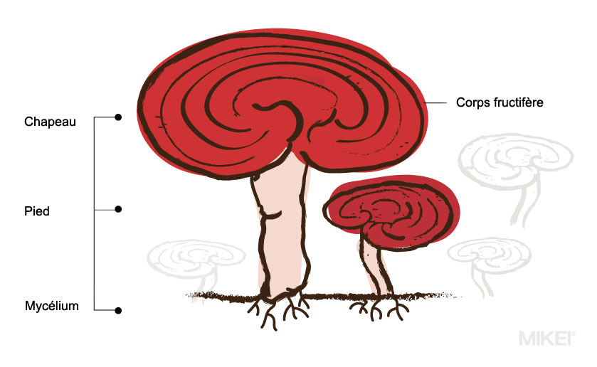 Le reishi, l’un des champignons médicinaux les plus étudiés, mérite qu’on s’intéresse de plus près à sa structure unique et à ses bienfaits. Il se compose essentiellement de deux parties : le mycélium et le carpophore (pied et chapeau).